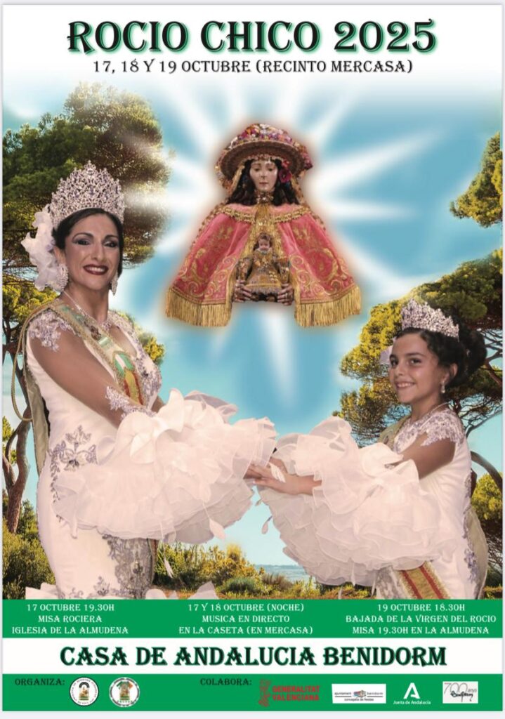 El Rocío Chico que organiza la Casa de Andalucía de Benidorm es una mezcla de devoción, música rociera, gastronomía y traje corto: misa rociera en la Parroquia Nuestra Señora de la Almudena, posterior “bajá” de la Virgen y celebración en la carpa/recinto con actuaciones, coros y actividades para toda la familia. En ediciones anteriores han participado la corporación municipal y la celebración ha atraído a centenares de vecinos, convirtiéndose en cita tradicional del otoño local. (benidorm.org)